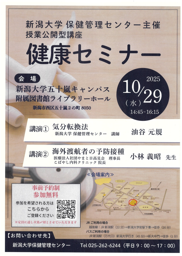 新潟大学保健管理センターから一般市民の方を対象とした健康セミナーのご案内をいただきました。新潟大学での開催となる貴重な機会と思いますので、ご興味ある方はご参加ください。